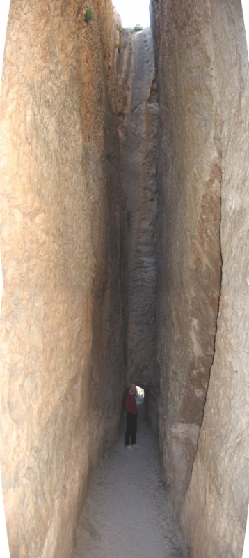 Detail of the deep chasm that was made for the construction of the aqueduct, looking west. The excavation was made in a similar way on both sides of the mountain, but the central section has not been excavated but operates as a tunnel of 15 roman feet long. It may at first seem puzzling that the effort was made to make such a beautiful straight cut, and then not excavate the central part. The reason is probably that the rock was needed anyway as ashlars for the adjacent aqueduct bridge, but if the central part had been excavated as well, the resulting chasm would probably have become instable and could have collapsed into the aqueduct. In a normal quarry, one would not have worried about this but the roman engineers probably realize that this was the cheapest, fastest and safest solution; and it is still standing after nearly 2000 years !