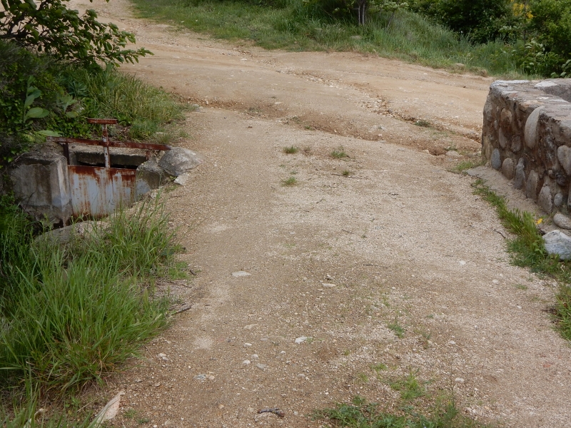 By means of a culvert under this dirt road the water (left) turns to the right into the regulation basin (right) and to the bridge.