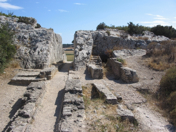 Specus of conduits B (left) and A (right) where they reach the Chaînon de la Pène limestone ridge, looking south. The concrete specus walls of B runs into an excavation that cuts the top of the ridge to reach the Barbegal mill site. Conduit A was originally lined with large limestone blocks, but this was supplemented by a concrete wall. Conduit A does not cut the ridge, but makes a sharp turn to the west