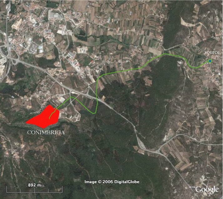The course of the Roman aqueduct from its source near Alcabideque to Conimbriga