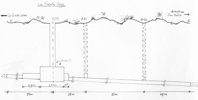 Cross-section (not on scale) of the excavated part (150m only) of the roman infiltration gallery (0,40m x 1,25m) of Huelva (Spain). From the central access - La Fuente Vieja - 14m to the N and 125m to the S was accessible. The latter part was provided with two manholes, mainly blocked by debris. This gallery could have been part of a more elaborate system under the cabezo. Other manholes were found 128m from the Fuente Vieja near the TV-relay station, another close to the calle Aragón in the cabezo San Pedro. The basin of the well measures 2,50m x 1,80m and is 1,80m high, probably of not-roman origin. The gallery is situated 40m under the surface and 20m above sea level.