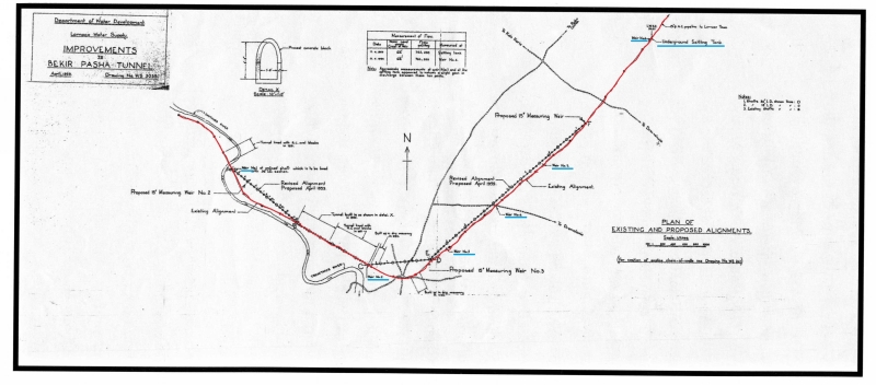 30 access shafts (black dots), and the 'underground settling tank' (drawing of the Department of Water Development).