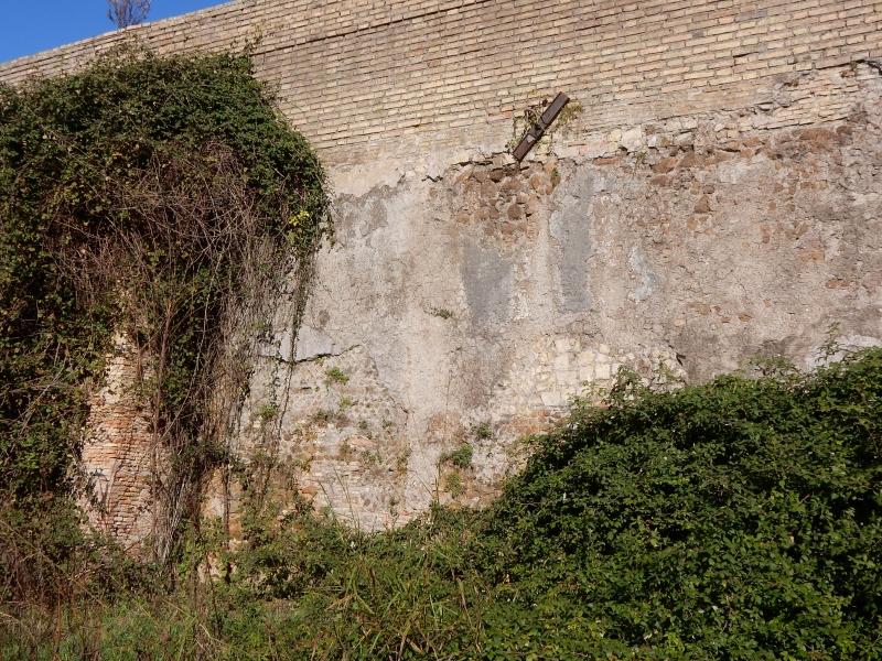 The rear / south side of the substructions of the Aqua Virgo / Acqua Vergine at Pietralata. Note the opus reticulate work. The wall above it is clearly of more recent date. At left also a buttress here.