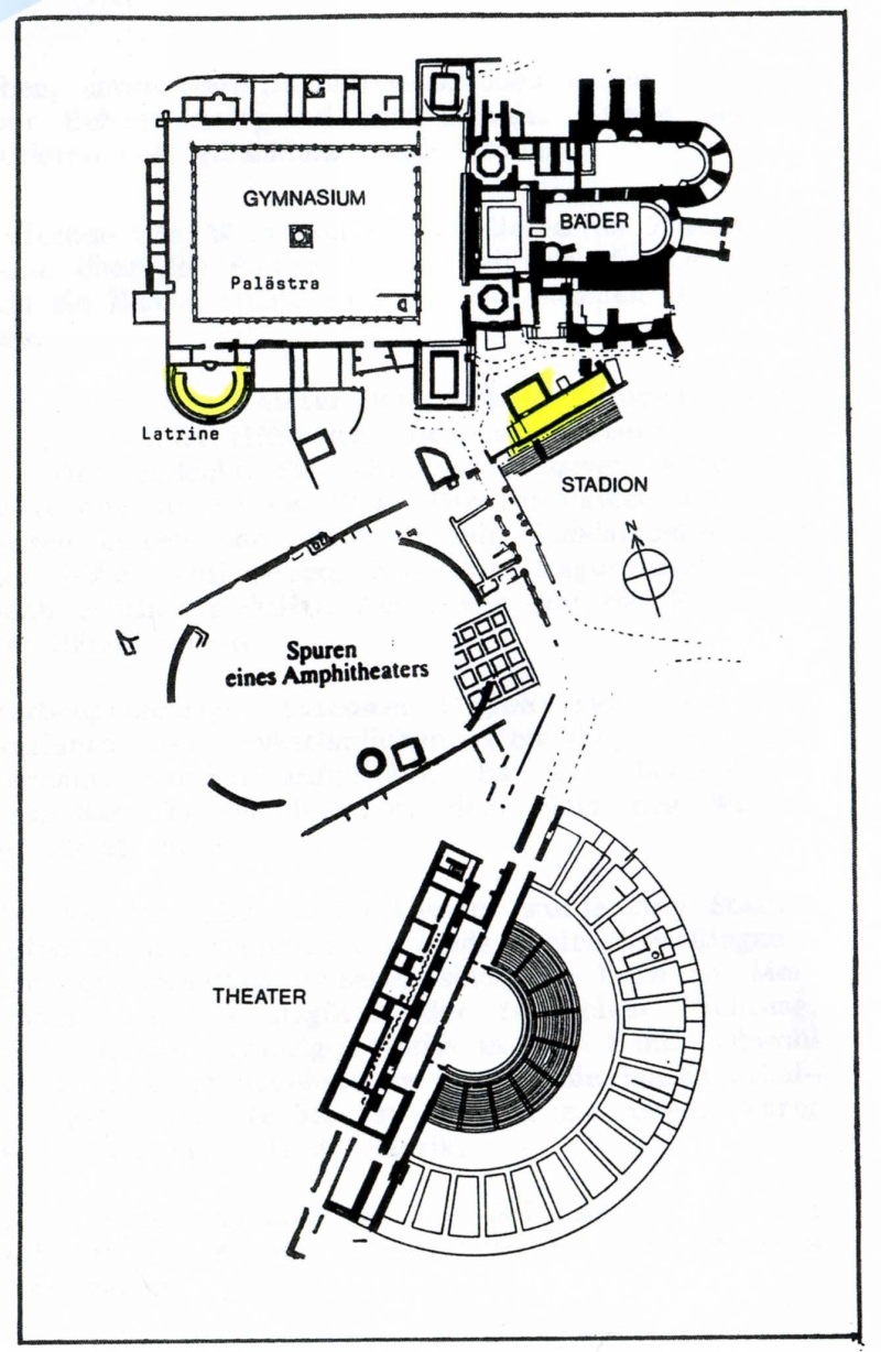 To the north the palaestra and bath complex, to the south the partly restored theater. In between