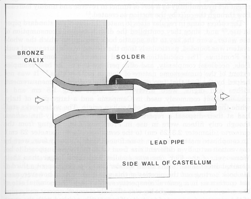 Distribution and usageOnce in or near the city, water from the aqueduct often passed into a large, covered settling-basin; here the water was supposed to deposit its sediment. Water from the settling-basin was distributed in the city through a distribution basin, the so-called castellum divisorium. In Rome, before the water reached the distribution basins it sometimes flowed through free-flowing canals like the Arcus Neroniana. After passing the point of distribution terracotta pipes and/or fistulae (lead pipes) transported water to many facets of the city: public, private, and imperial.The description of a castellum (distribution basin) by Vitruvius (8.6.1-2) reads as follows: When it [the water] has reaches the walls of the city, build a reservoir (castellum aquae) and adjoining the reservoir a three-part reservoir compartments connected with the reservoir to receive the water. Within the reservoir lay three systems of pipes, one for each of the connecting tanks, so that when the water runs over from the tanks at the ends, it may run into the central tank. The piping system for all the public pools and running fountains should be put in the middle tank; pipes for the baths in one of the outside tanks, to provide tax revenue every year for the people of Rome; and in the third tank the piping system should be directed to private homes, so that there will never be a shortage of public water for private citizens will not be inclined to divert public supplies if they have their own supply from the same source.This description is often wrongly interpreted as a system with three separate water networks in a city and a hierarchy favouring water for public use. It only informs us about the distribution of surplus water! None of the excavated distribution basins resembles this description. The one in Nimes was a circulare basin with one square inlet and in the rim ten outlets for lead pipes; in the floor three holes possibly acting as extra outlets, overflows or for cleaning. The Pompeian examble divided the water in seperate streams towards three outlets. This was the first order division sending the water to second order basins. Over 15 water towers acted also as points of distribution to private users and fountains nearby. UsersWater was provided for a variety of users including ordinary people by means of fountains, private users, public baths buildings and (in Rome) naumachia. Surplus and waste water was used to flush latrines, streets and/or the sewers.With a few exceptions, the water from the aqueducts reached only the ground floor of apartment buildings. The tenants of the upper floors had to rely on slaves to carry water or go themselves and draw water from the nearest fountain. Because fire was a constant concern, Romans were encouraged to keep water stored in their rooms. It is not difficult to imagine the problem sixth-floor residents, with no running water, had in dealing with fire and public sanitation. Residents of apartment buildings lived with a constant fear of fire (Juvenal): for what disheartens worse than the exhausting dangers of this town, the dread of flashfire's ruin or falling houses or poets spouting their dull, awful verses.Many must also have lived in a constant state of squalor. In fact, fire probably served an important public sanitation function. We know that Rome was struck by massive fires on several occasions. Most notable was the fire during the reign of the Emperor Nero which destroyed large sections of Rome because the city had no effective means of stopping the spread of the fire. Juvenal (1965, p. 43) indicated that arson was a problem, " . . . rumors hint that he set his house afire".