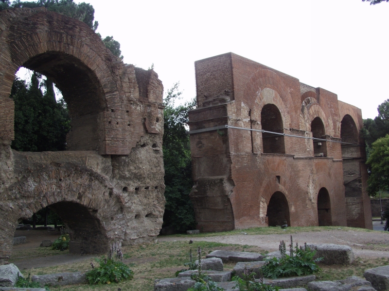 The extension from the Arcus Neroniani to the Palatine: a look up to the Palatine slope from these arches makes it obvious that the arches as they stand were not nearly high enough to deliver water to the top of the hill. Several hypotheses attempt to explain what the original structure must have looked like to accomplish this. Asby supposes that the present two-tiered structure formed a base for an inverted siphon. More widely accepted is the theory that the original arcade was twice as high and consisted of two further tiers of arches on top of the remaining two (after Aicher 1995). | ||||||||||||||||||||||||||||||||||||||||||||||||||||||||||||||||||||||||||||||||||||||||||||||||||||||||||||||||||||||||||||||||||||||||||||||||||||||||||||||||||||||||||||||||||||||||||||||||||||||||||||||||||||||||||||||||||||||||||||||||||||||||||||||||||||||||||||||||||||||||||||||||||