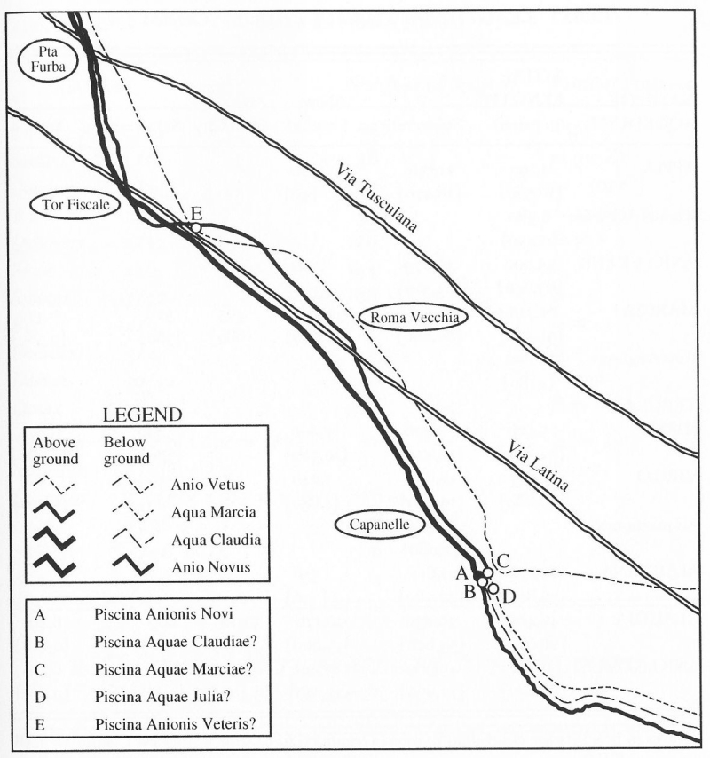 "Six of these waters are received in covered settling-tanks located this side of the seventh milestone on the Latin Road" according to Frontinus 19.1 in a translation by R.H. Rodgers 2003 inwhich piscina has been translated as settling tanks - I prefer the word basins here. The six were the Anio Vetus, Aqua Marcia, Tepula, Julia, Claudia and Anio Novus. Only the basin of the Anio Novus has been attested, near Villa Bertone. Rodgers 2004 pag 349 |