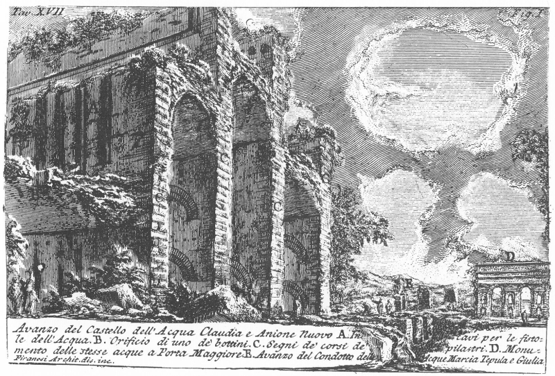 The only known remains of the (second order) distribution basin(s) of the Aqua Claudia and the Anio Novus, as drawn by Piranesi as 'Castello dell'Acque e Anione Nuovo' Piranesi Antichita I tav 38 fig I; Lanciani Tavole II.5a |