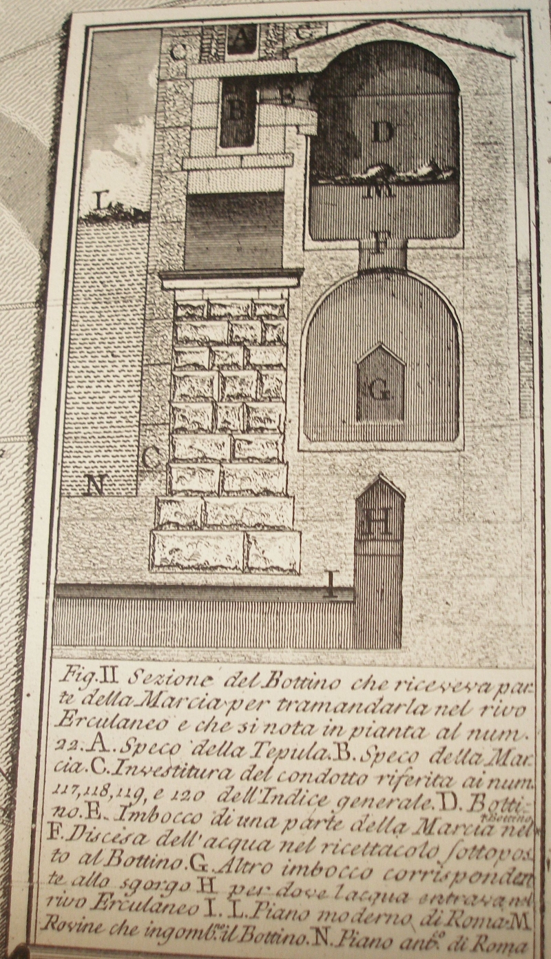 Splitting basin in the Aqua Marcia at the start of the Rivus Herculaneus Piranesi Antichita I tav 38 fig 2 |