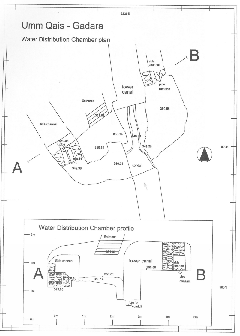 Subterranean distribution under the Roman town of Gadara (Jordan) A distribution facility in one of the two aqueduct tunnels of Gadara to unknown users. Drawing: Kerner 2004 |