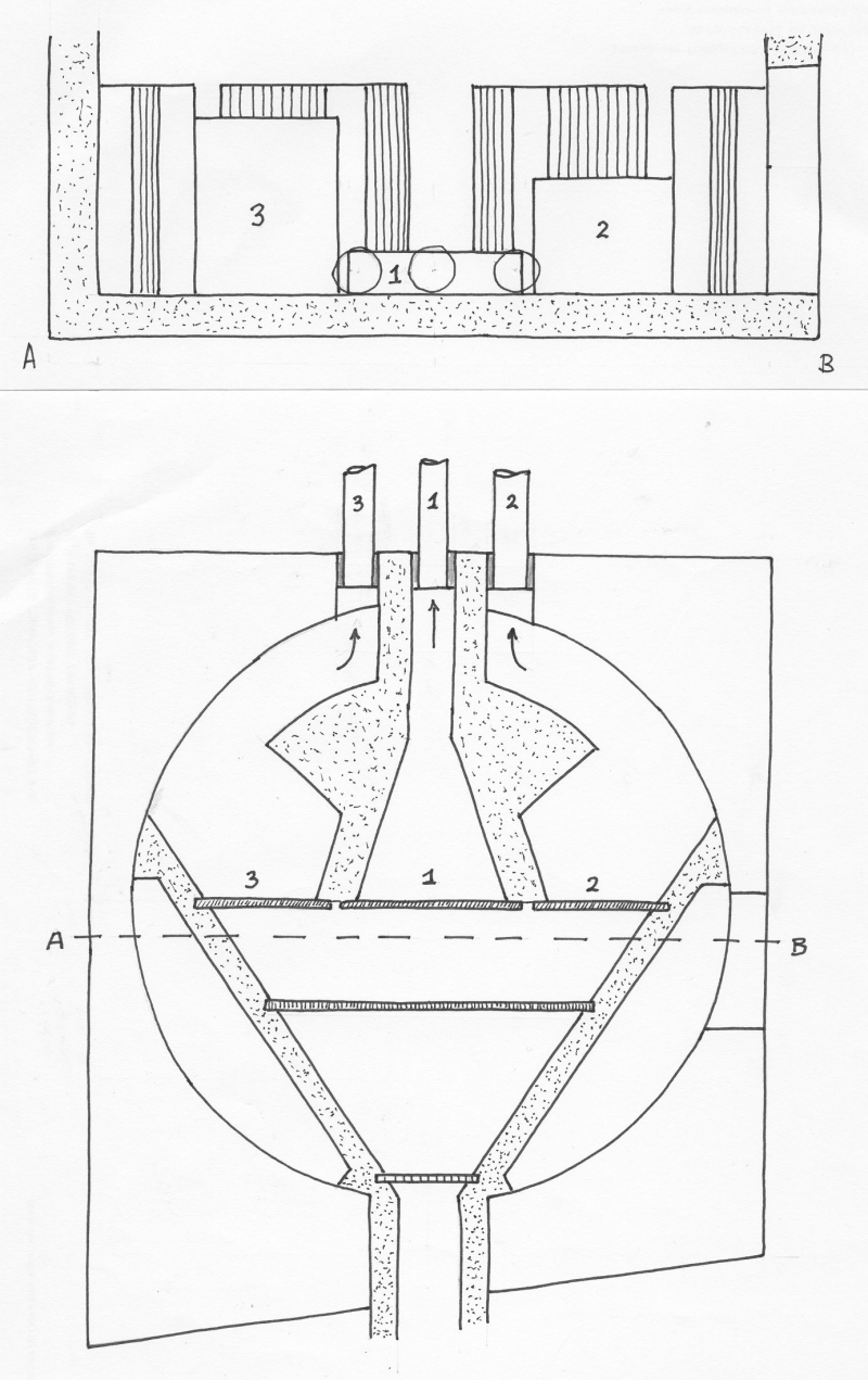 Distribution basin at Apamea (Syria). Round table of stone with a stand-up collar, in the middel one incoming pipe and at the edge a ring of 12 outgoing pipes; control by means of massive or peirced plugs. Drawing: C. Romeijn |