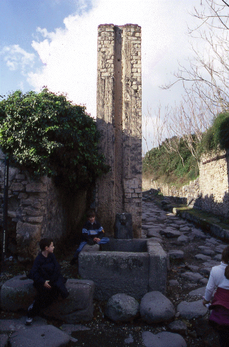 One of the many first order distribution basins in Pompeii (Italy) with a street-side basin in front. On top of the towers a lead tank (basin) has been attested with one inlet near the top (??) and several outlets in / near the bottom of the tank. These towers had also a function for press reduction als the water distribution system - like Pompeii as a whole - was built on a sloping terrain. |