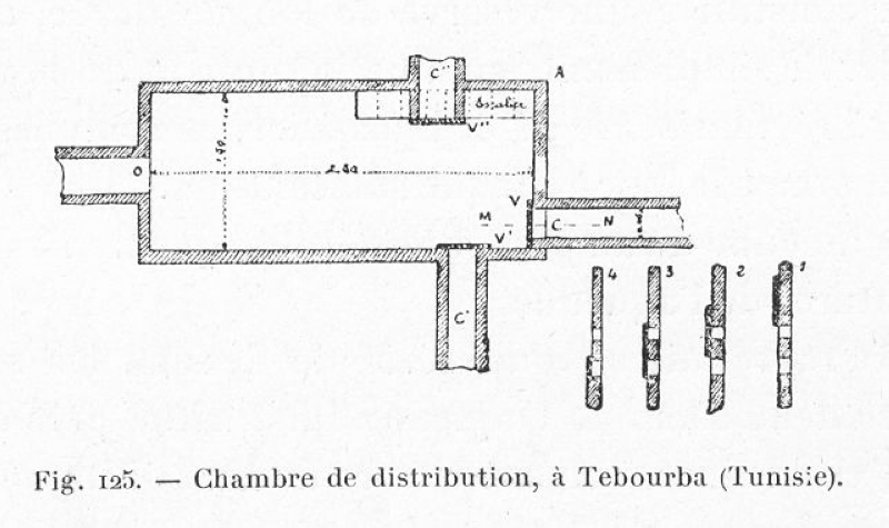 Distribution basin at Tebourba (Tunisia). Rectangular basin with one inlet O and three outlets (C, C' and C''), one of which (C) controlled by a sluice. Drawing by C. Germain de Montauzan 1908. |