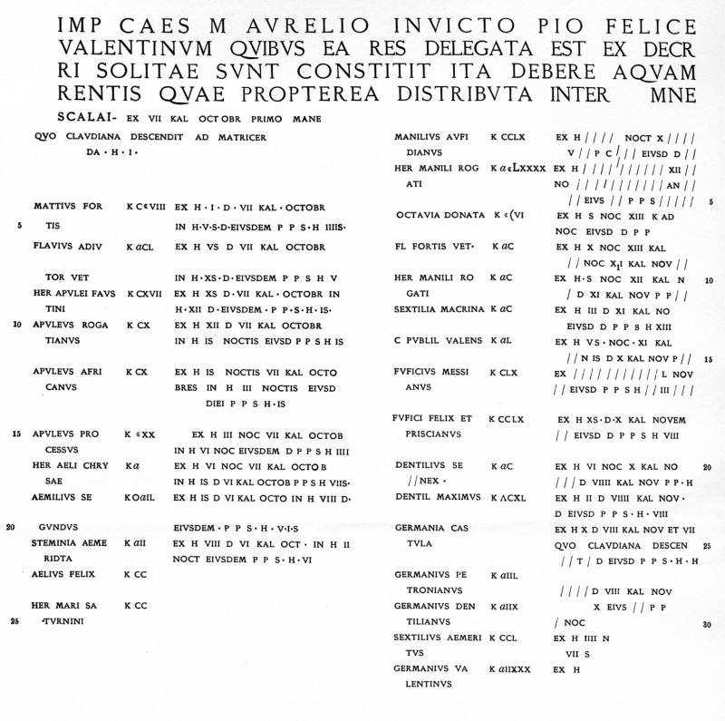 CIL 6.31566 Description of the distribution of Alsietina water by allotment of time |